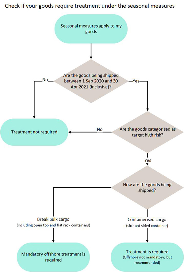 Departmana güvence sağlamak için, mallar Avustralya'ya gelmeden ve tahliye edilmeden önce, Mevsimsel Zararlı Politikasına e-posta yoluyla departmana bir risk yönetimi planı sunulmalıdır . Bunun yapılmaması, malların boşaltılmasının reddedilmesine ve ihracata yönlendirilmesine neden olabilir.